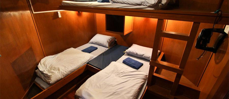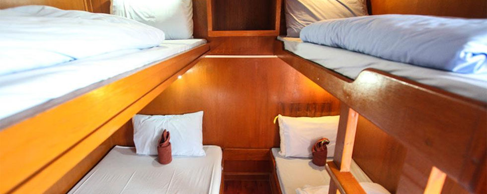 Manta Queen 3 accommodates 28 guests in comfortable air conditioned cabins of which three different types are available: Double and Twin bed ensuite cabins, Twin bed non ensuite cabins and 4 bed shared cabins to suit groups and families.